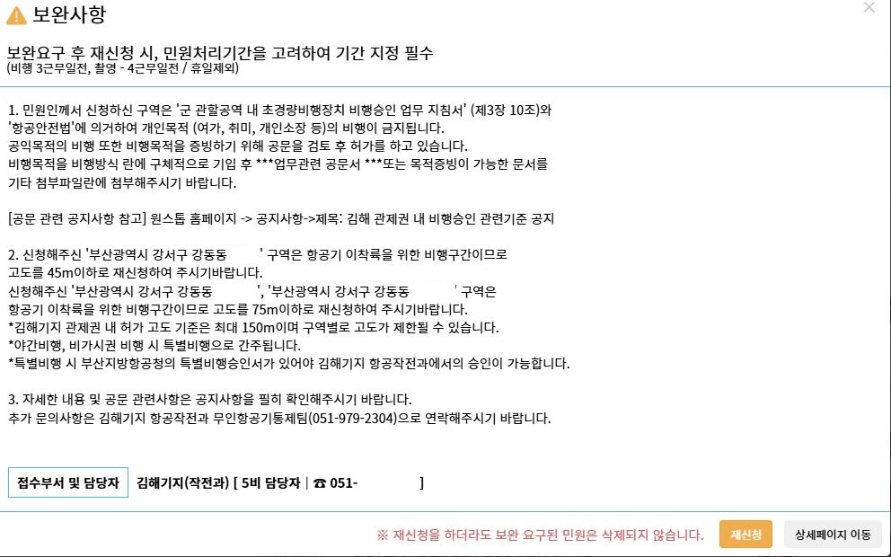드론 원스탑 시스템을 통해 비행 신청을 넣었고, 해당 구역이 김해공항의 관제 통제권 내에 있는 만큼 공항 관제실의 비행 허가도 필요했다. 단순한 체크박스를 넘어서 ‘비행 목적’, ‘시간’, ‘고도’, ‘안전 확보 방안’까지 상세히 기입해야 했고, 무선 교신 장비를 사용할 수 있는 조종자만이 이 지역에서의 비행 승인을 받을 수 있었다.