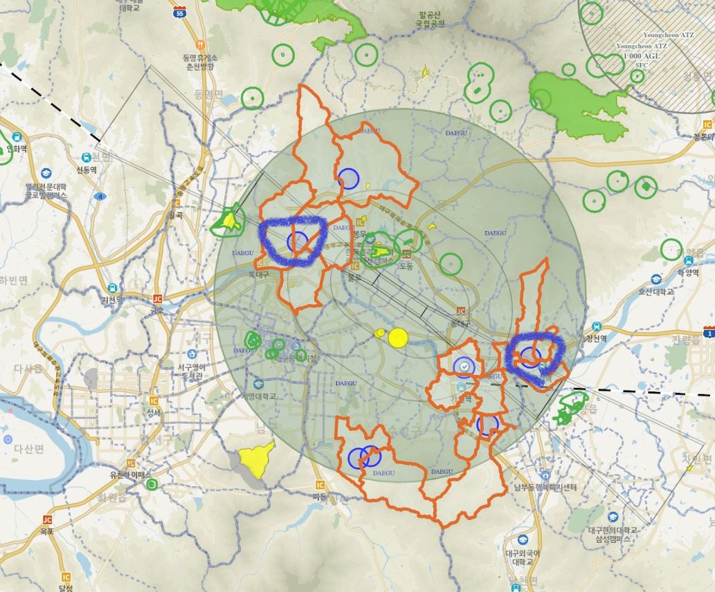 - 회색 원형: 대구 공항 관제권(CTR, Control Zone)
