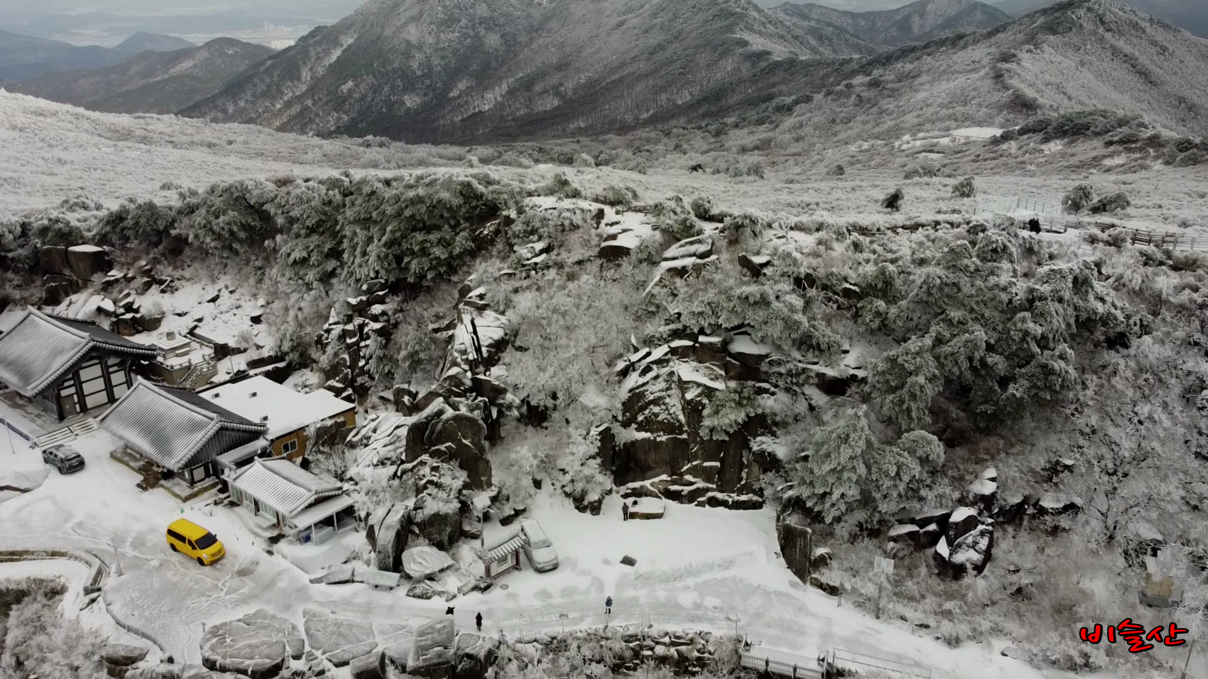 대견사에 도착한 뒤, 나는 드론을 띄웠다. 드론을 통해 내려다본 풍경은 감탄을 자아내기에 충분했다. 대견사 뒤쪽으로 펼쳐진 참꽃 군락지는 아직 꽃을 피우진 않았지만, 흰 눈과 붉은 가지들이 어우러져 하나의 겨울 정원처럼 보였다. 얼어붙은 풍경 속에서도 생명을 머금은 나뭇가지들, 그리고 그 사이를 타고 흐르는 산 능선의 리듬이 너무도 인상적이었다.