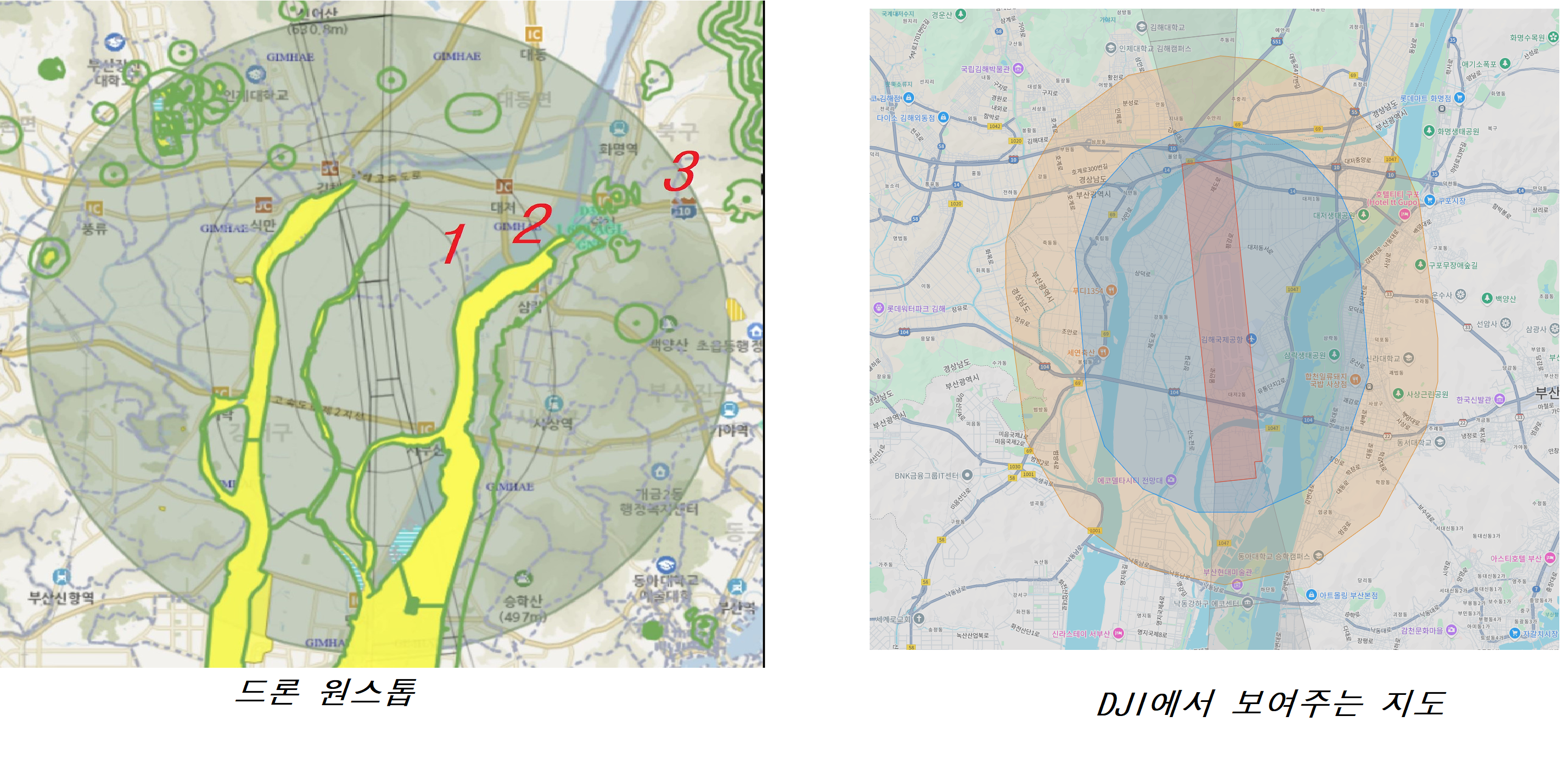 김해 관제권 1번지. 우리나라 항공안전지도상으로는 분명히 관제권으로 분류된 곳이지만, 막상 DJI 앱에서 지도를 보면 그 관제권의 범위가 다르게 표시됩니다.