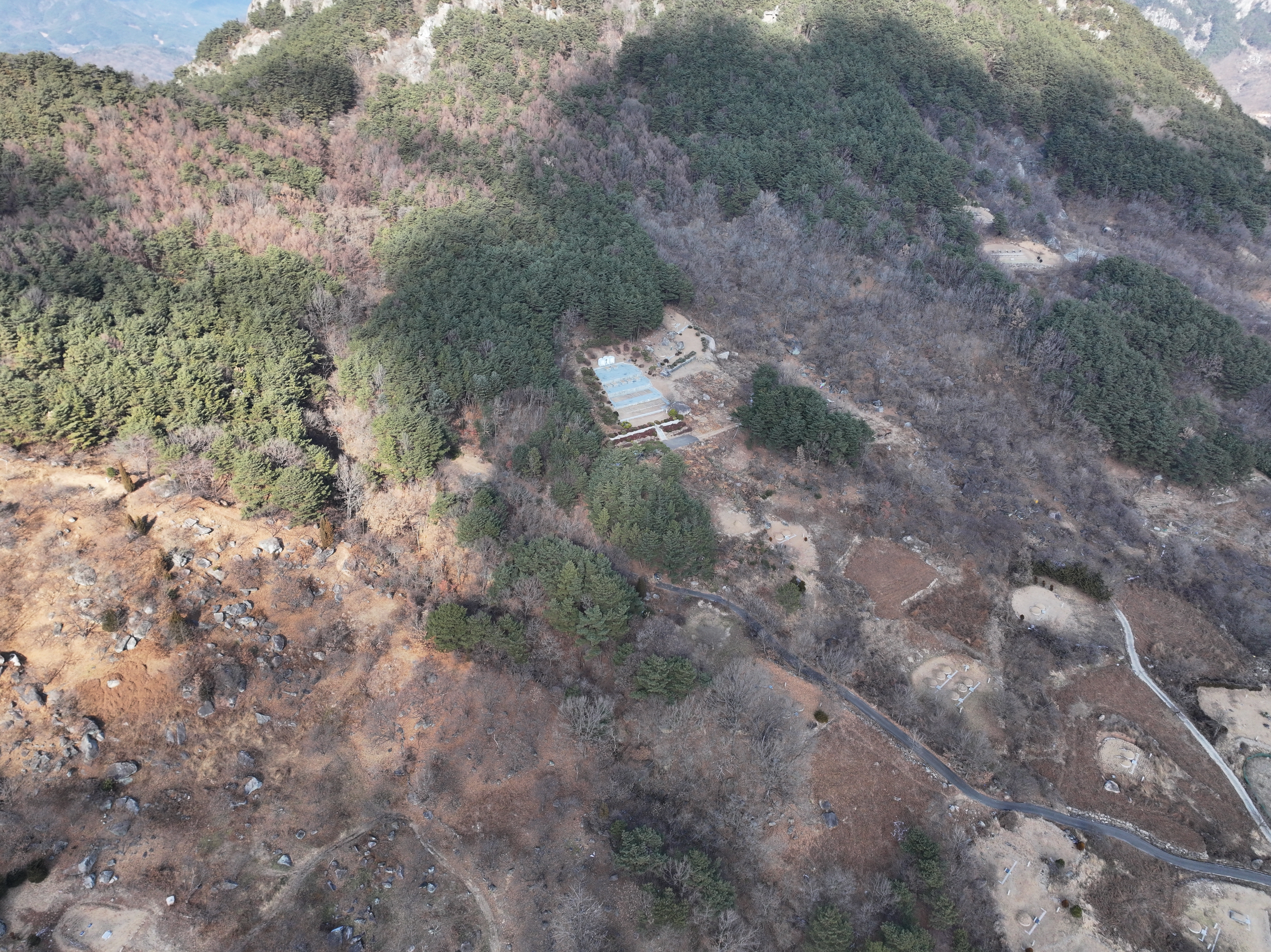 하늘에서 내려다본 이곳은, 개발 이전의 원형을 고스란히 간직하고 있는 그야말로 '자연 그대로'의 풍경이었습니다. 산세는 완만하고, 능선을 따라 이어진 나무들과 그 아래로 구불구불하게 흐르는 좁은 임도는 마치 시간이 멈춰버린 듯한 고요함을 안겨주었습니다. 아직 사람이 많이 드나들지 않은 공간이었기에, 풀 한 포기, 바위 하나까지도 무심히 놓여 있는 듯하면서도 절묘하게 균형을 이루고 있었습니다.